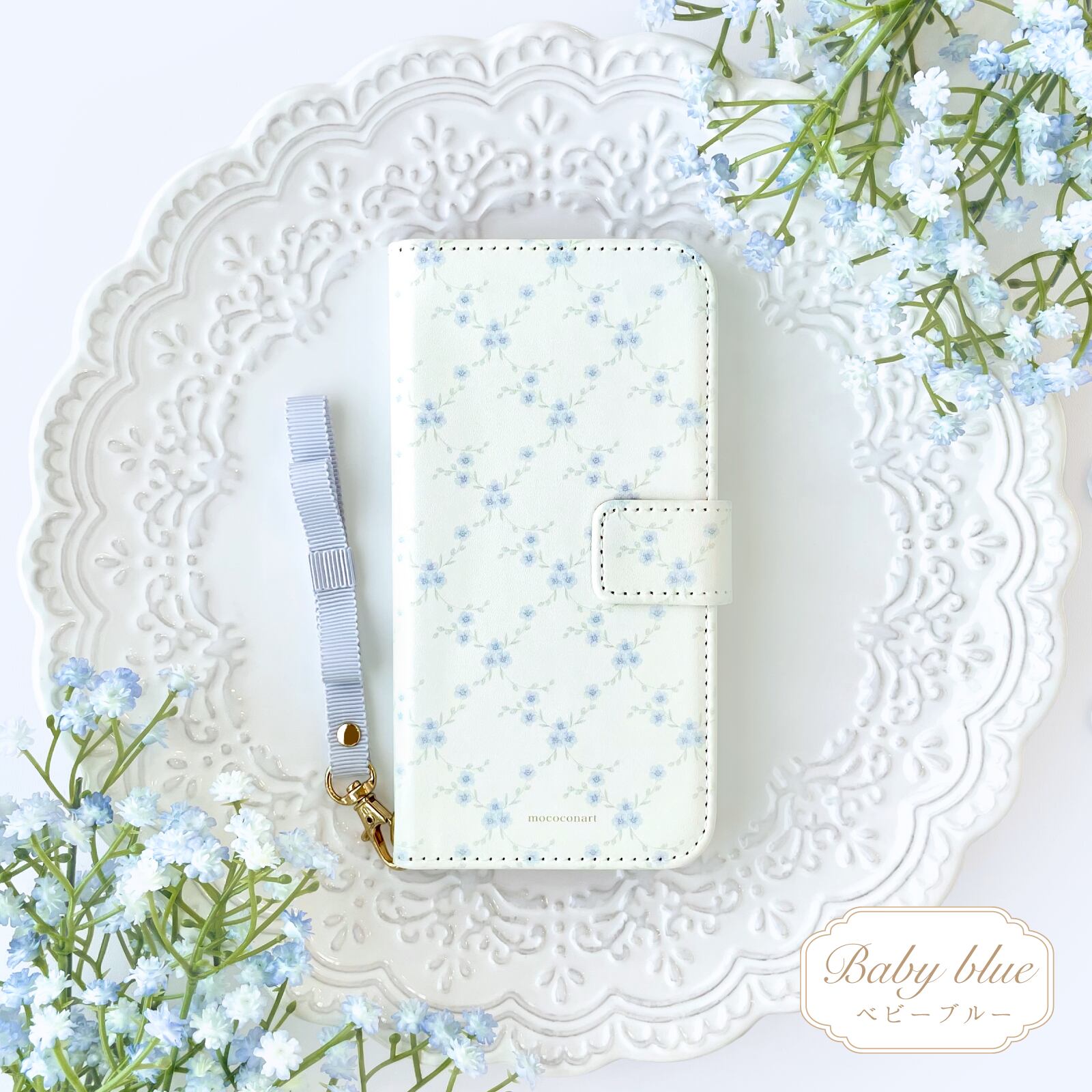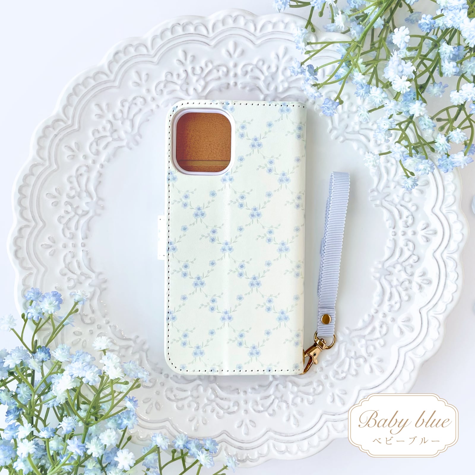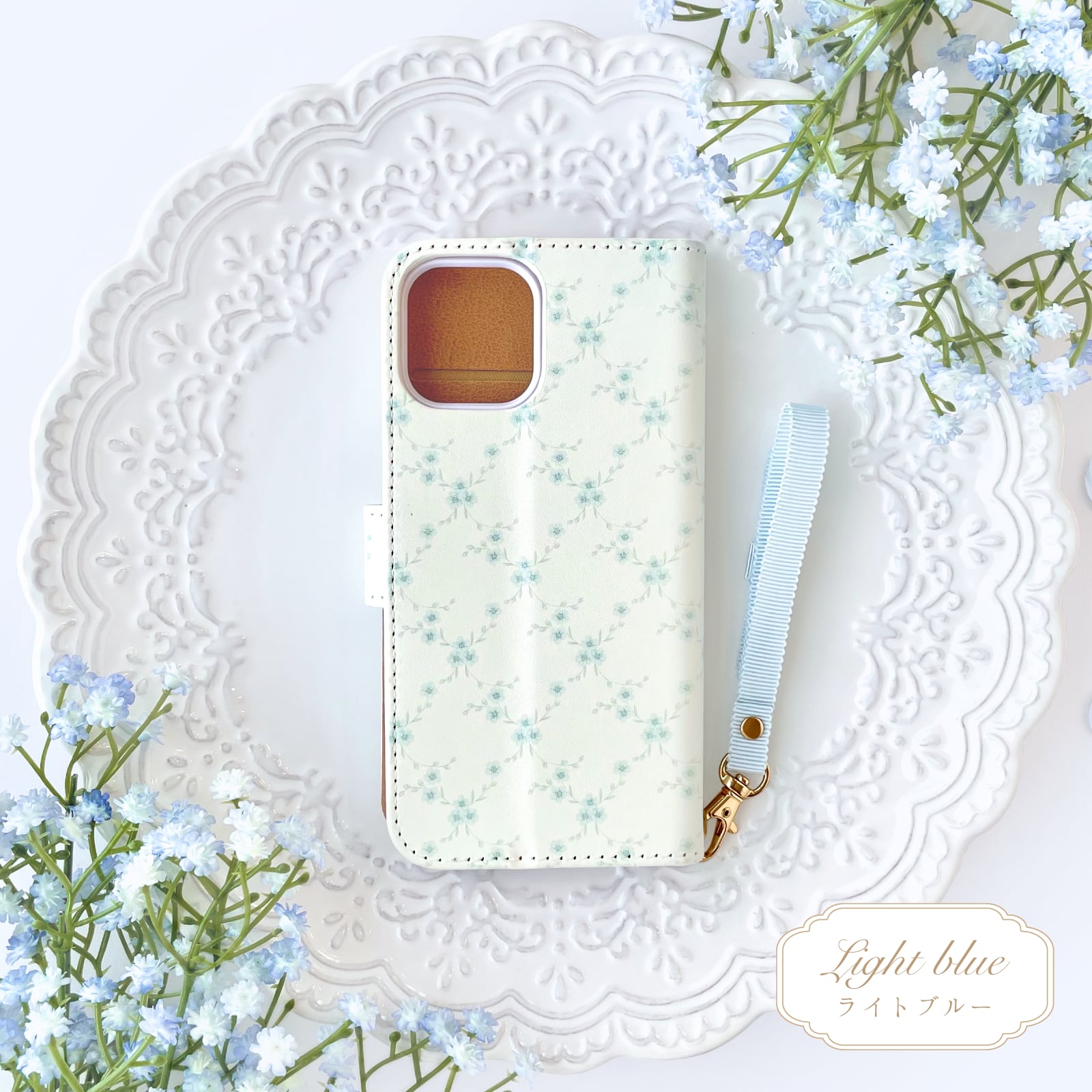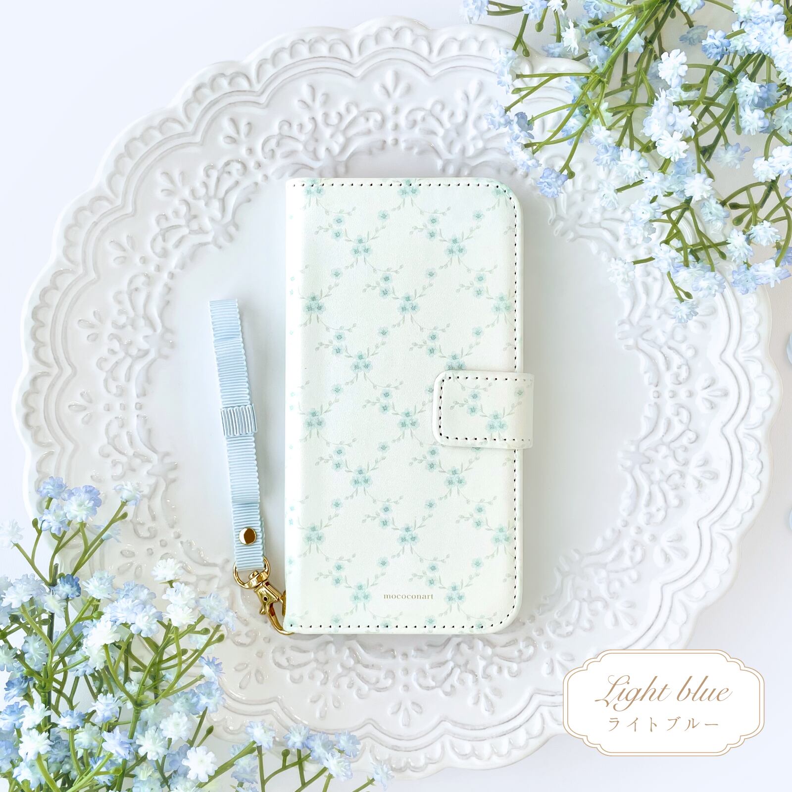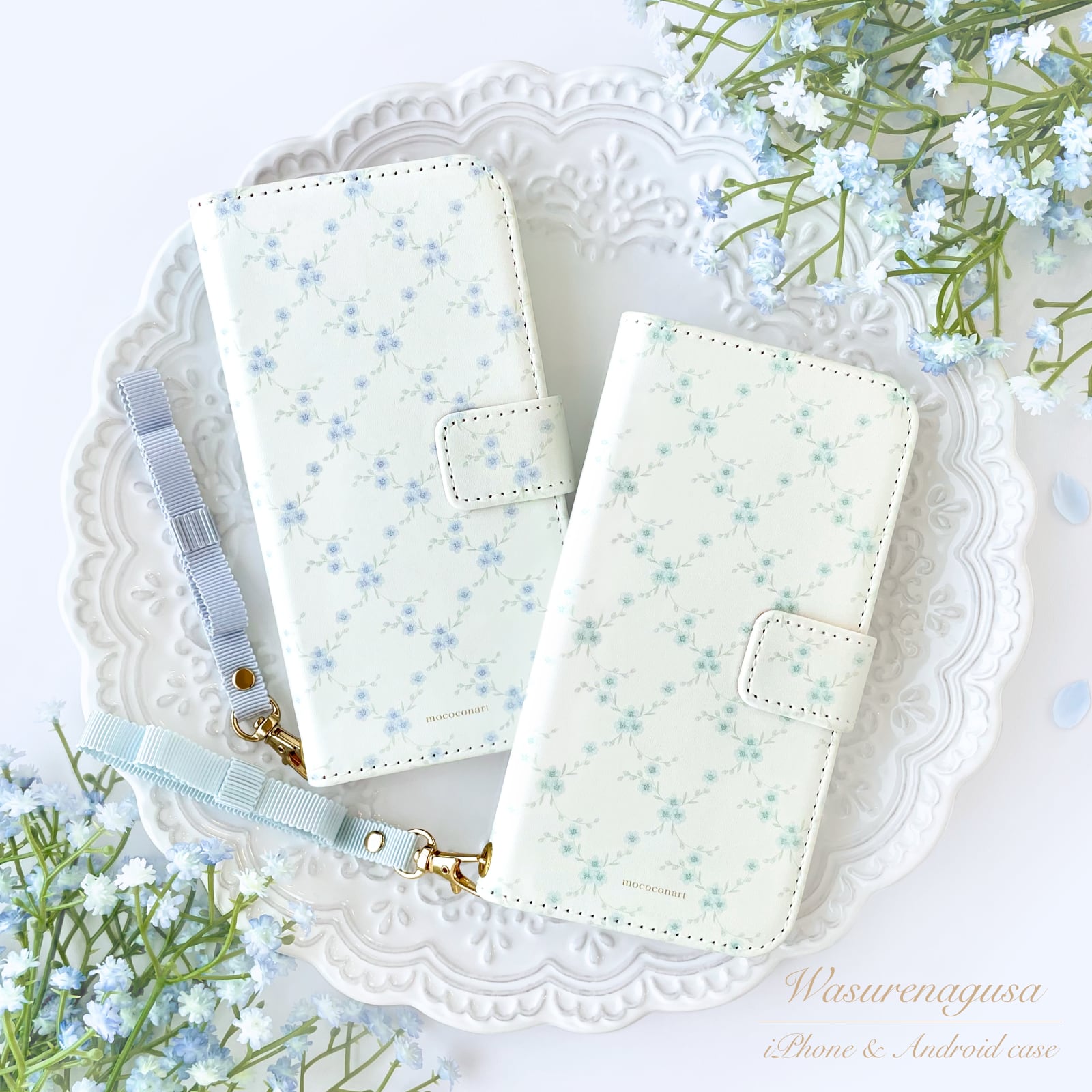 勿忘草柄 手帳型スマホケース リボンストラップ付き