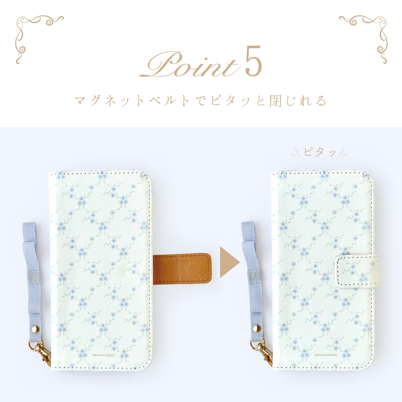 ・手帳部分:合成皮革(外側:ホワイト、内側:キャラメル)